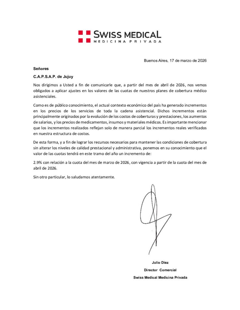 SWISS MEDICAL – INCREMENTO VALOR CUOTA ABRIL 2026.