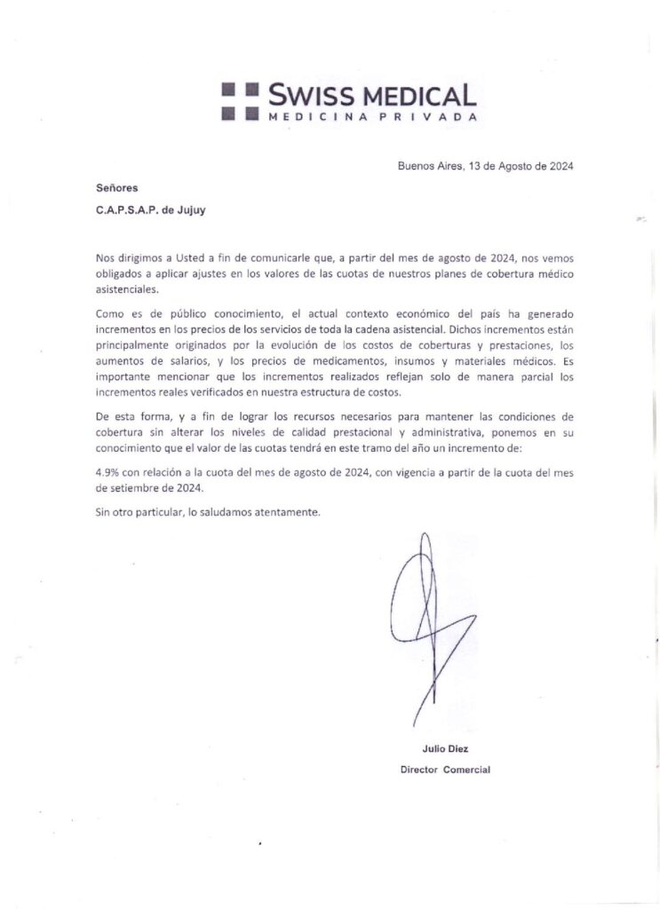 SWISS MEDICAL -INCREMENTO DE LA CUOTA DEL MES DE SEPTIEMBRE 2024.