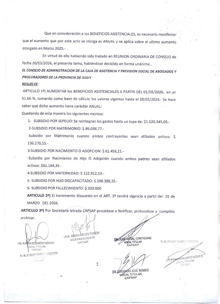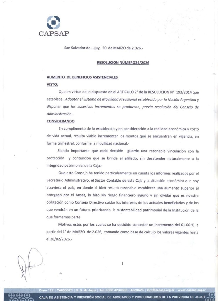 INCREMENTO DE BENEFICIOS ASISTENCIALES-MARZO 2026-RES N°24/2026 CAPSAP.