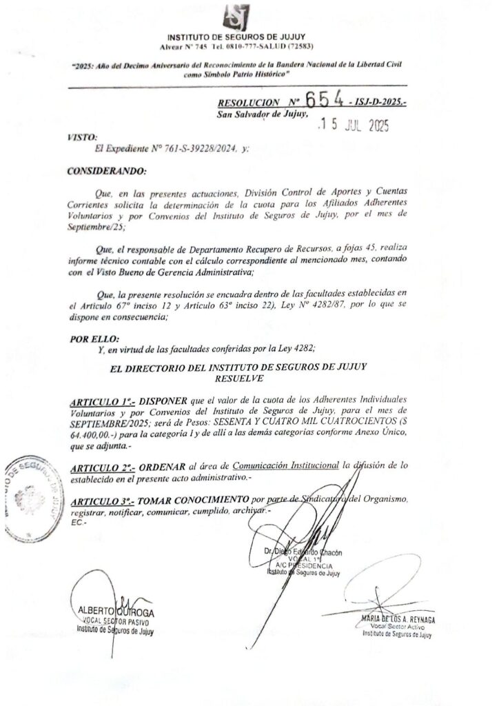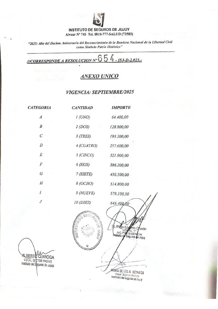 ISJ- INCREMENTO VALOR CUOTA MES SEPTIEMBRE 2025- RES N° 654-ISJ-D-2025 Y ANEXO UNICO RES N° 654- ISJ- D- 2025. 27 de agosto de 2025